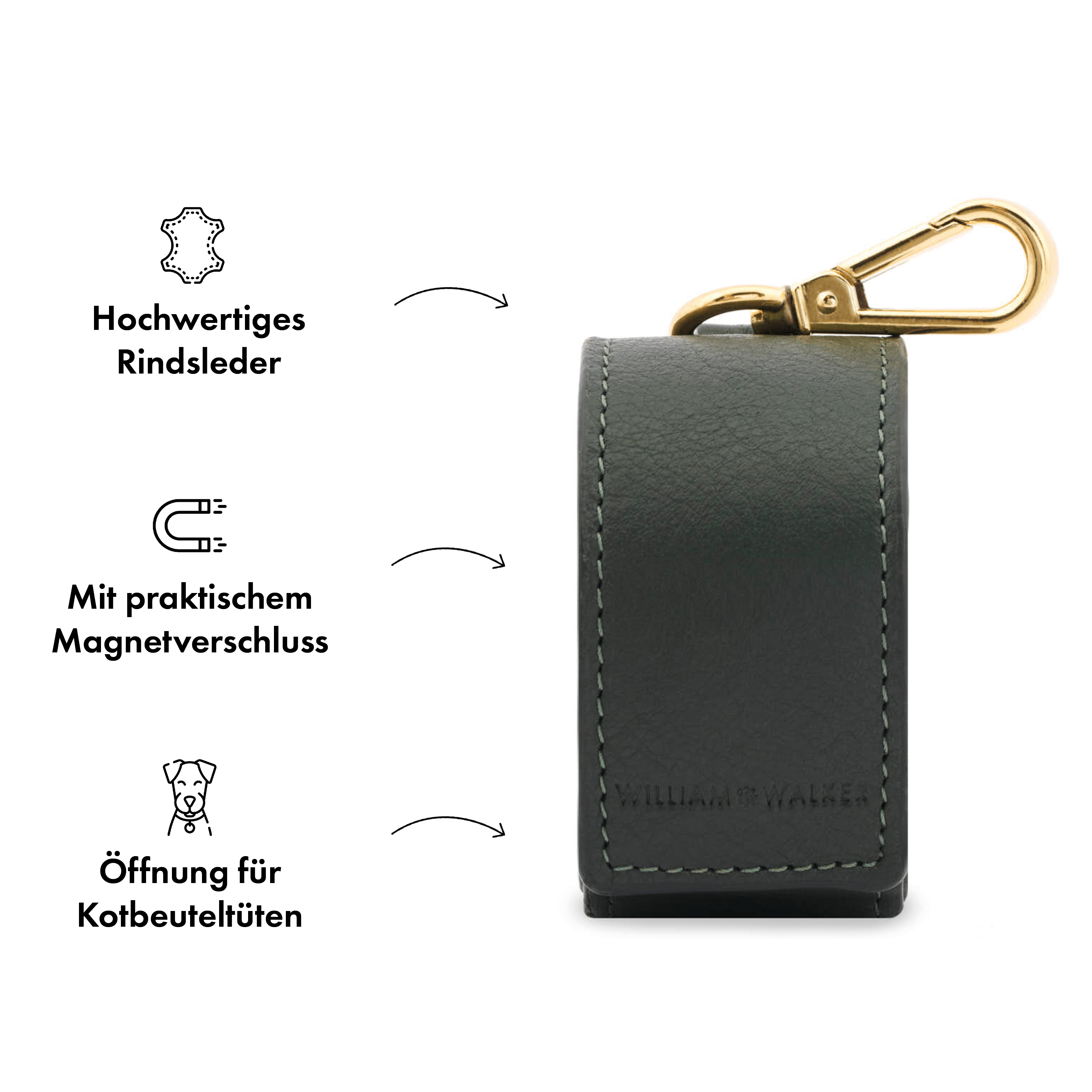 William Walker Hochwertige Leder Hundeleine Dark Moss (Waldgrün) 3-fach verstellbar (Länge 2m) / Standardgröße (Breite 2cm | Große Karabiner | Halsband S-XL)William Walker Kotbeutelspender Dark Moss