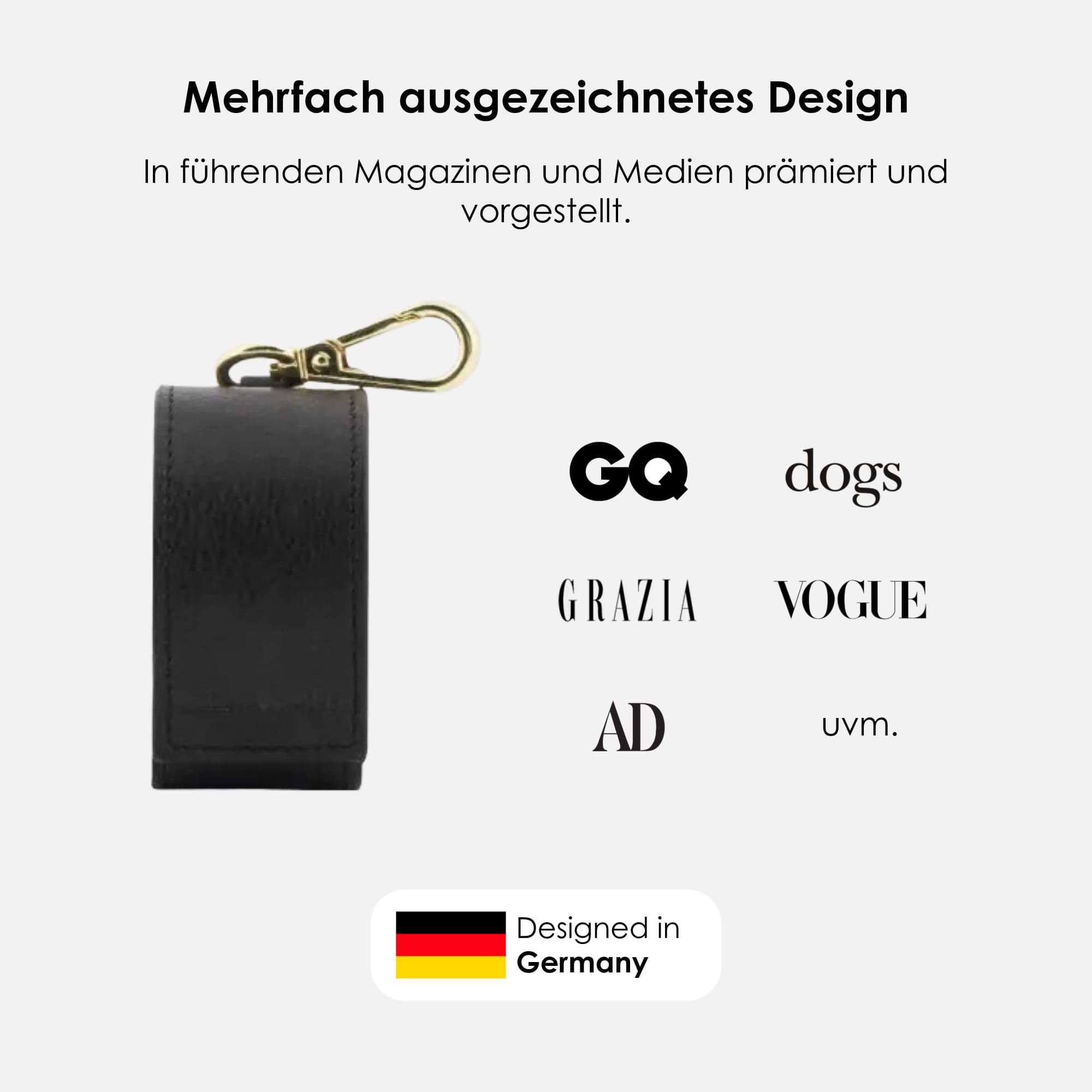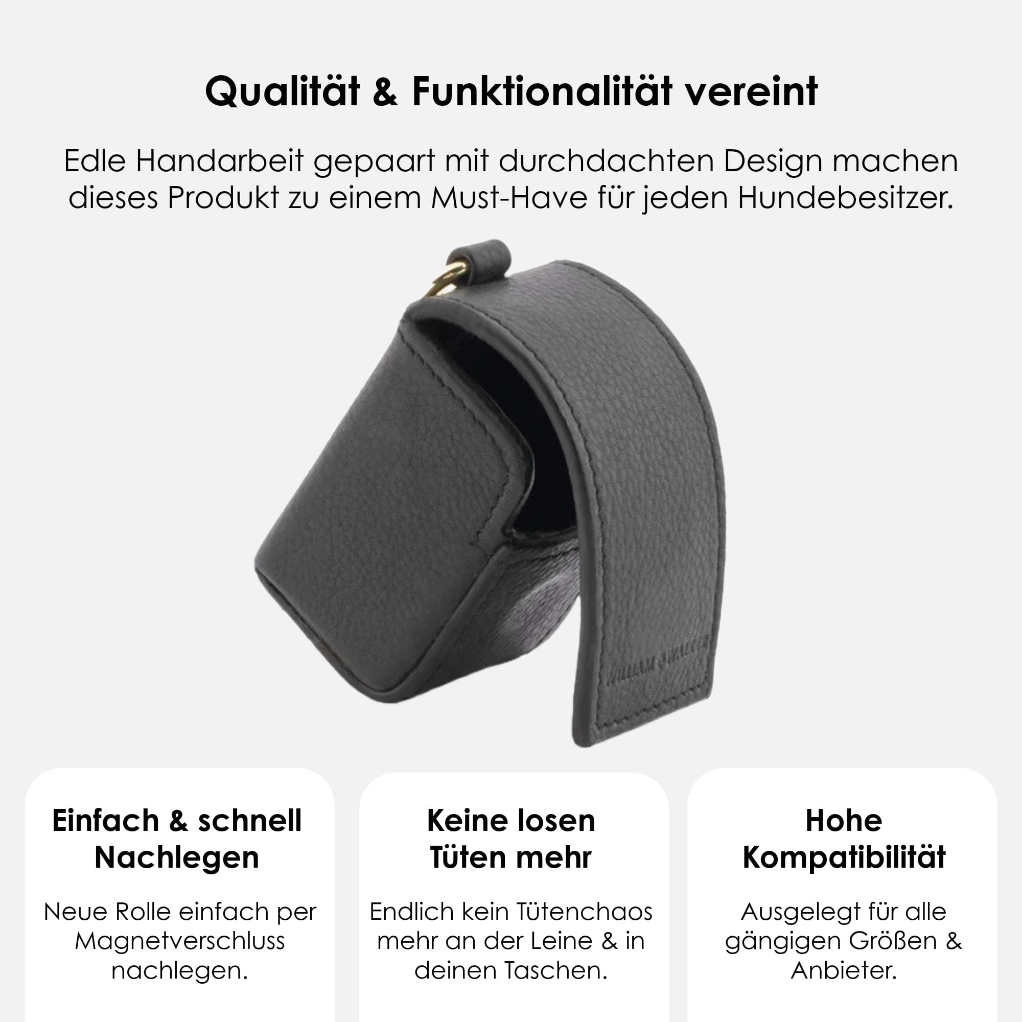 Hochwertiger Kotbeutelspender aus schwarzem Leder mit Öffnung zum Herausziehen auf der Rückseite. Einfache Anbringung dank Karabiner.