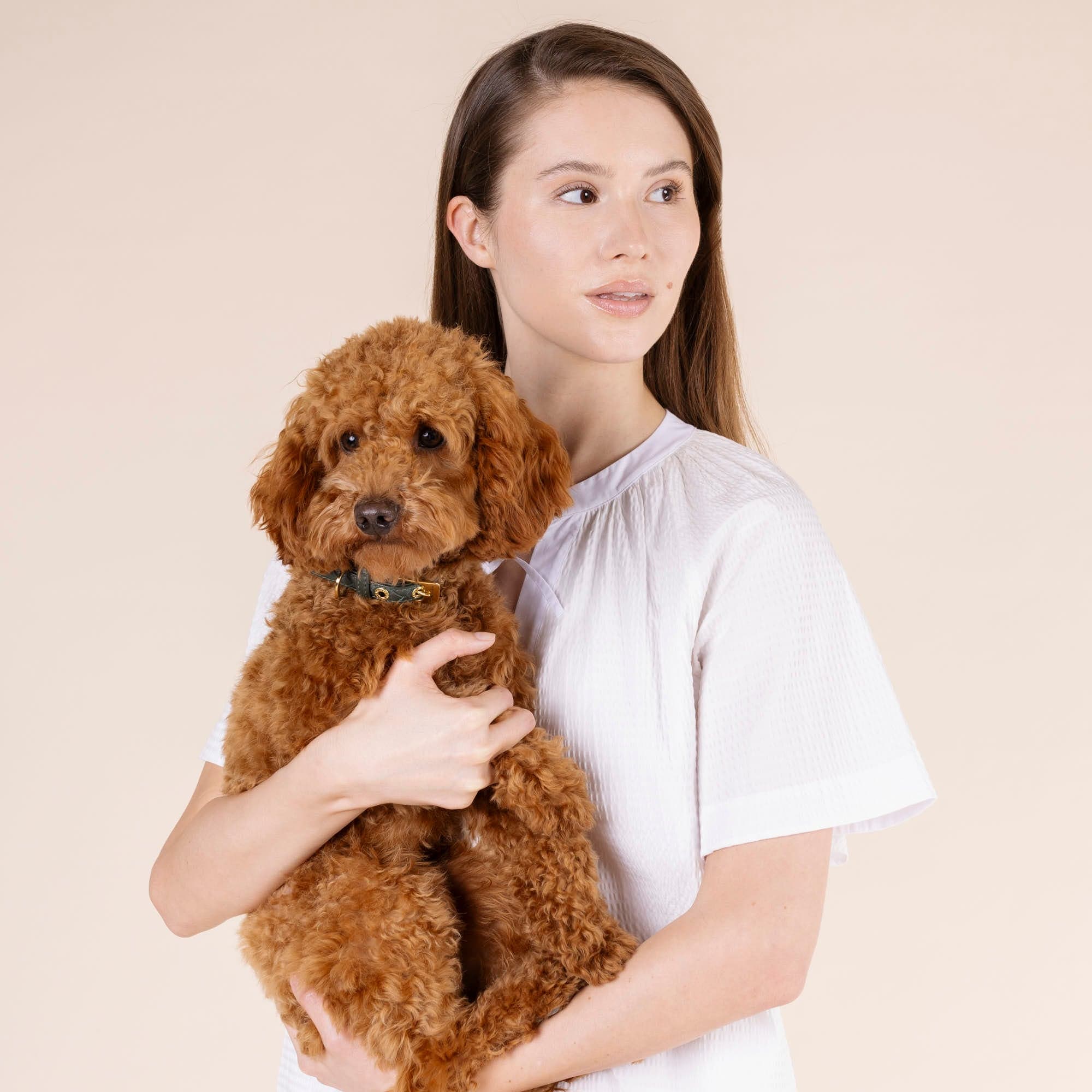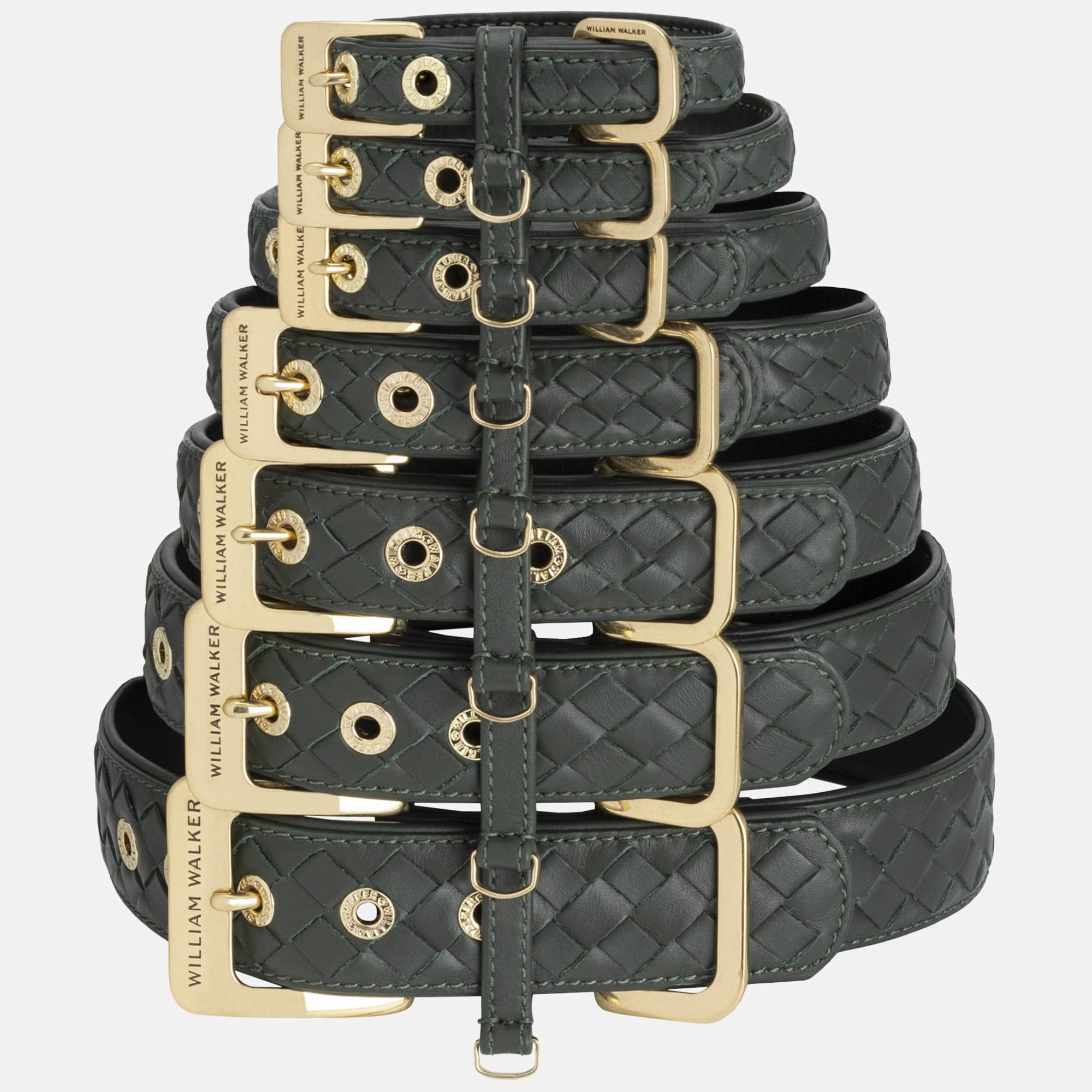 Cuello de piel de napa verde oscuro elaborado a mano con herrajes de latón dorado y suave acolchado en el interior para un máximo confort.