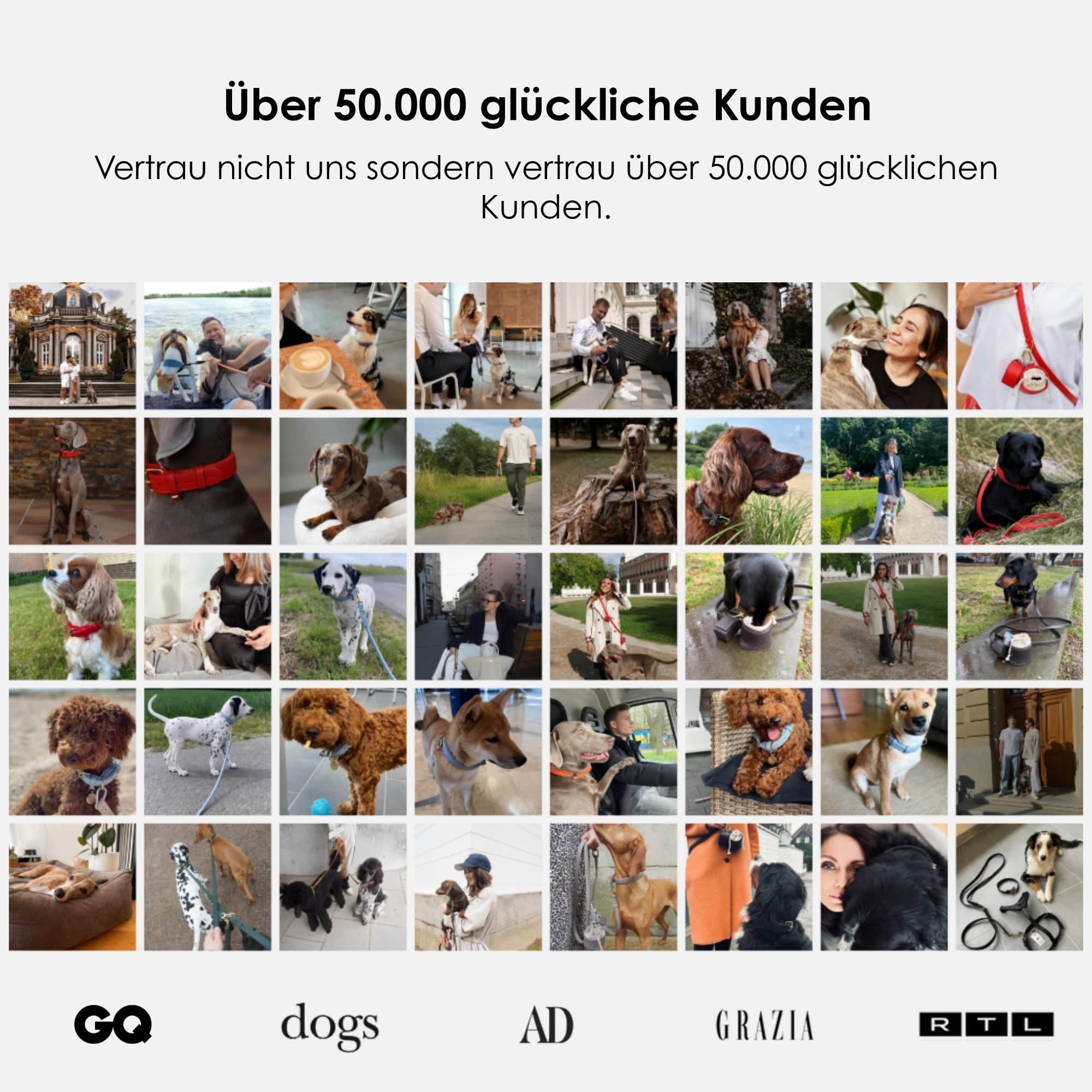 Nuestras correas están disponibles en dos tamaños diferentes. El tamaño estándar tiene una anchura de 2 cm y se recomienda para las tallas de collar S-XXL. La versión pequeña es más fina (sólo 1,5 cm en lugar de 2 cm) y tiene accesorios mucho más ligeros. Por lo tanto, la correa pequeña está especialmente adaptada a las necesidades de los perros pequeños, tanto por razones de peso como visuales. La recomendamos para las tallas de collar XXS y XS.