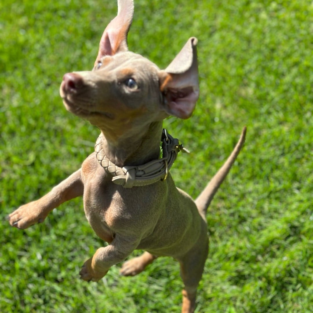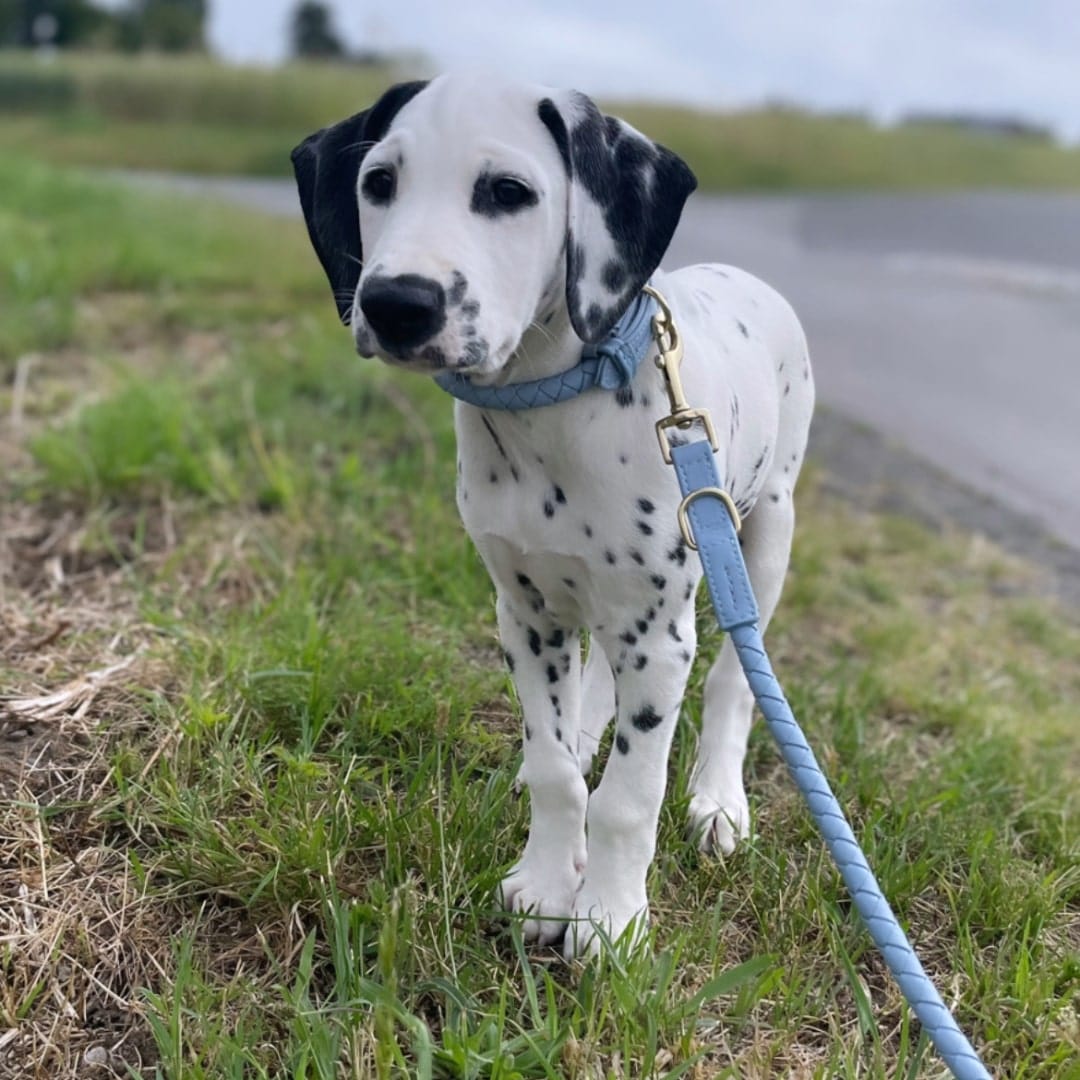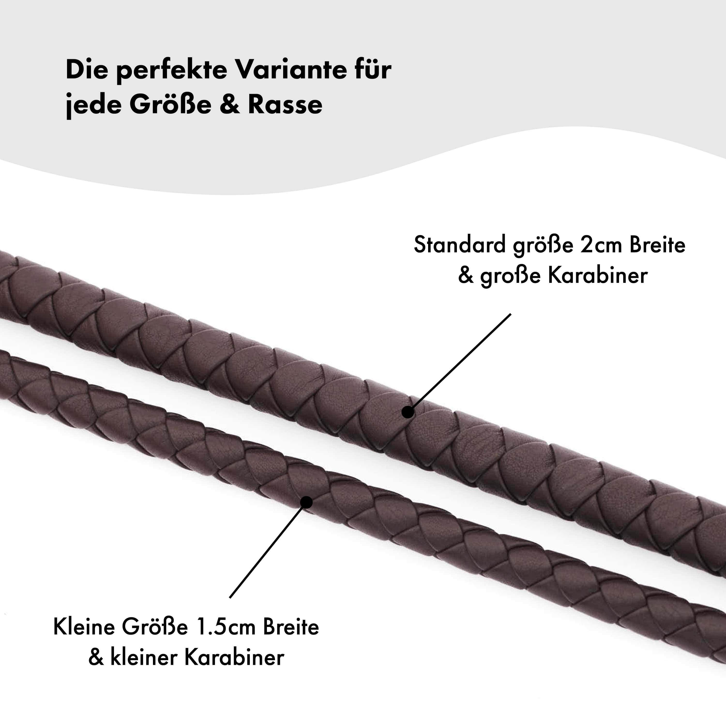 Nuestras correas están disponibles en dos tamaños diferentes. El tamaño estándar tiene un diámetro de 1,5 cm y se recomienda para las tallas de collar M-XXL. La versión pequeña es más fina (sólo 0,9 cm en lugar de 1,5 cm) y tiene accesorios mucho más ligeros. Por lo tanto, la correa pequeña está especialmente adaptada a las necesidades de los perros pequeños, tanto por razones de peso como visuales. La recomendamos para las tallas de collar XS y S.