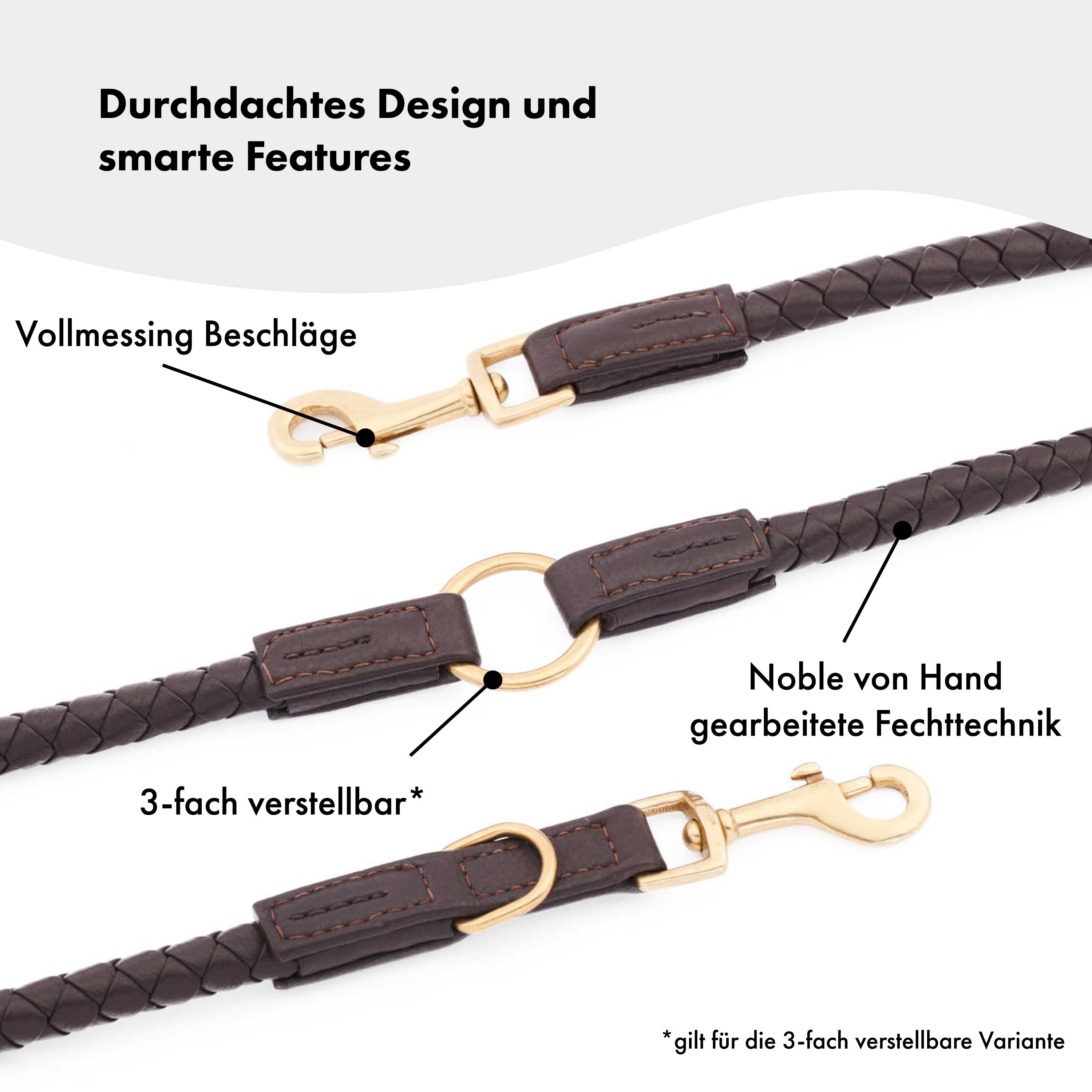 La correa ajustable de 3 vías tiene dos mosquetones, dos anillas en D y una junta tórica para que la correa pueda ajustarse a tres longitudes diferentes. Por lo tanto, se puede utilizar de forma flexible y es la elección adecuada para el uso diario.