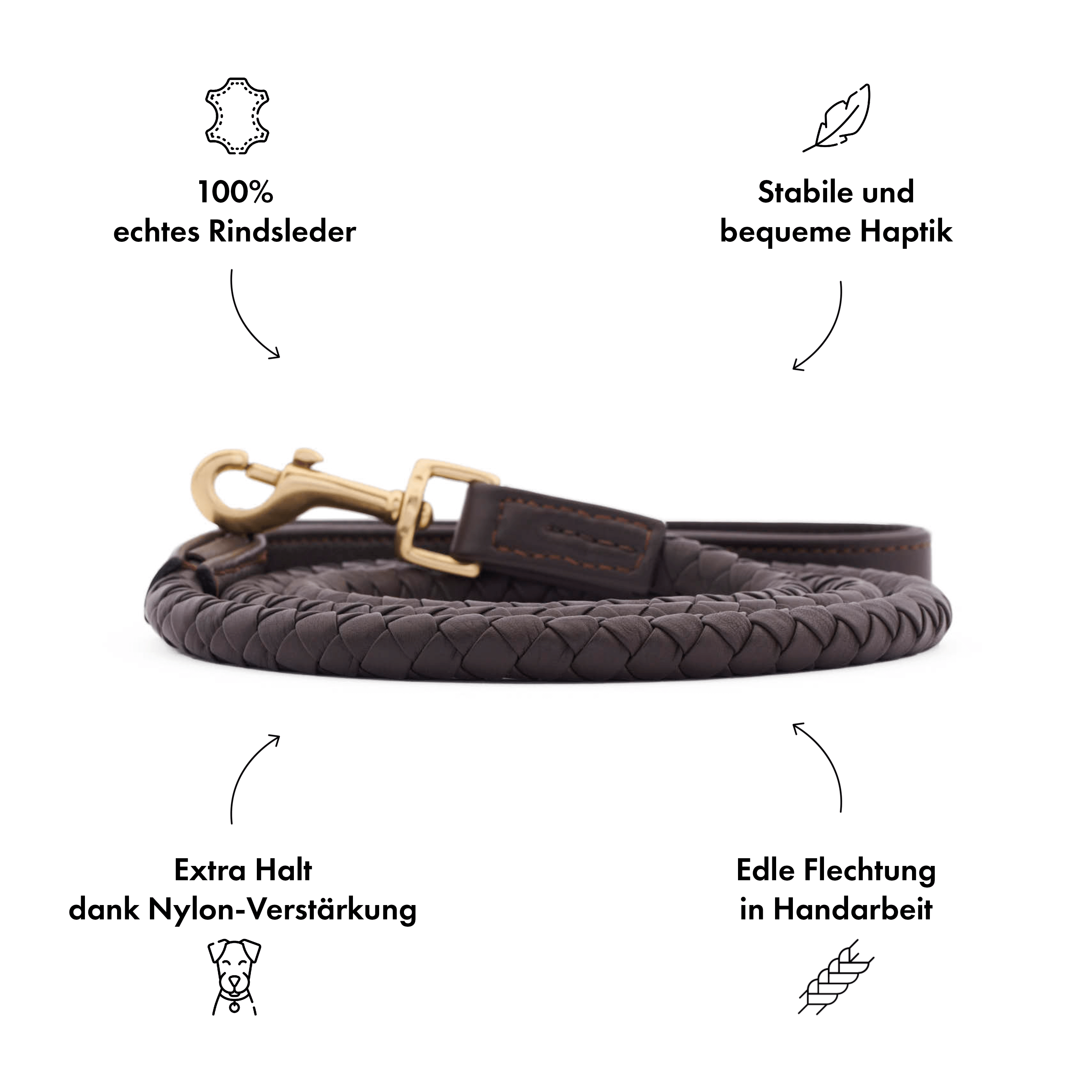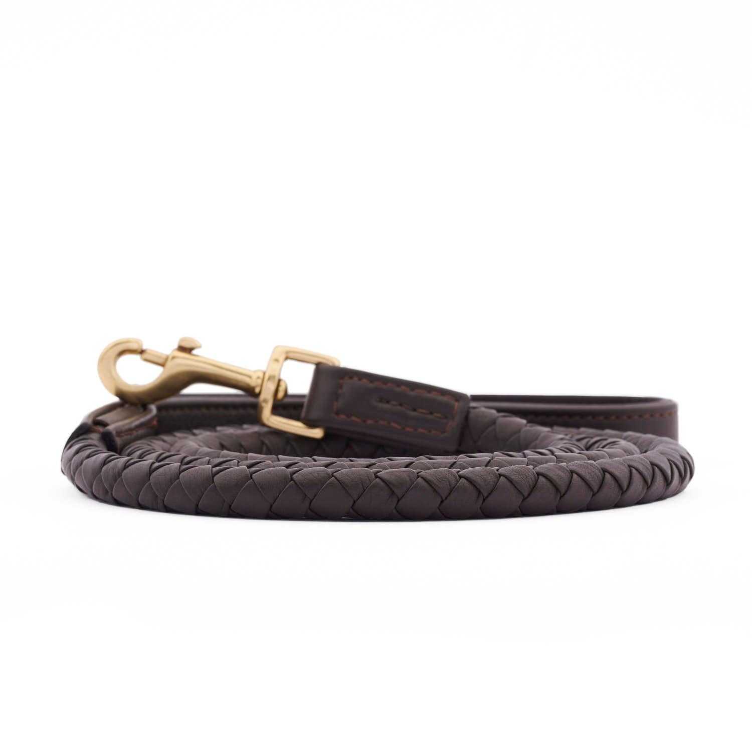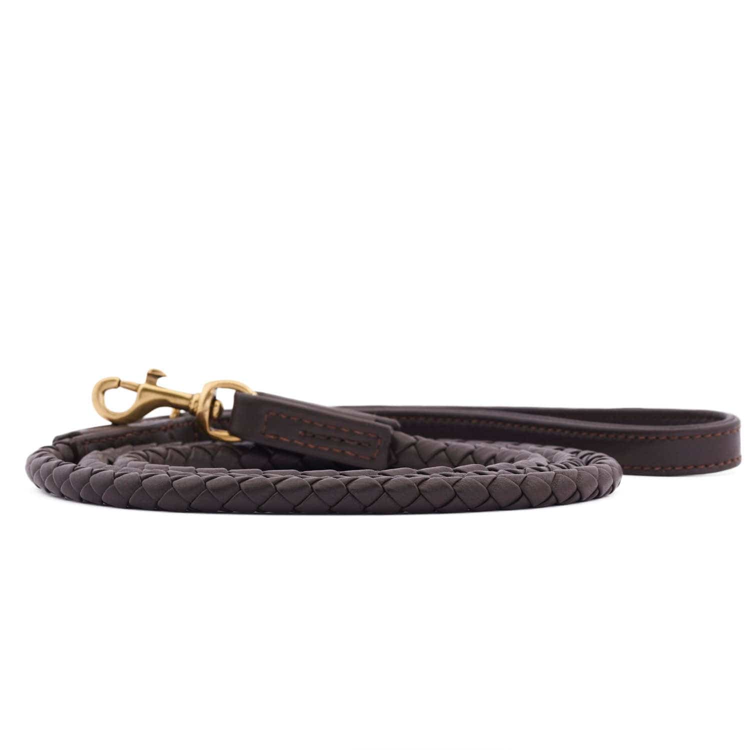 Correa de cuero marrón oscuro trenzada a mano con herrajes de latón dorado. Para perros grandes y pequeños.