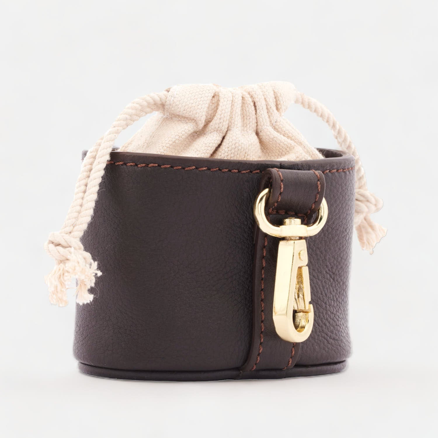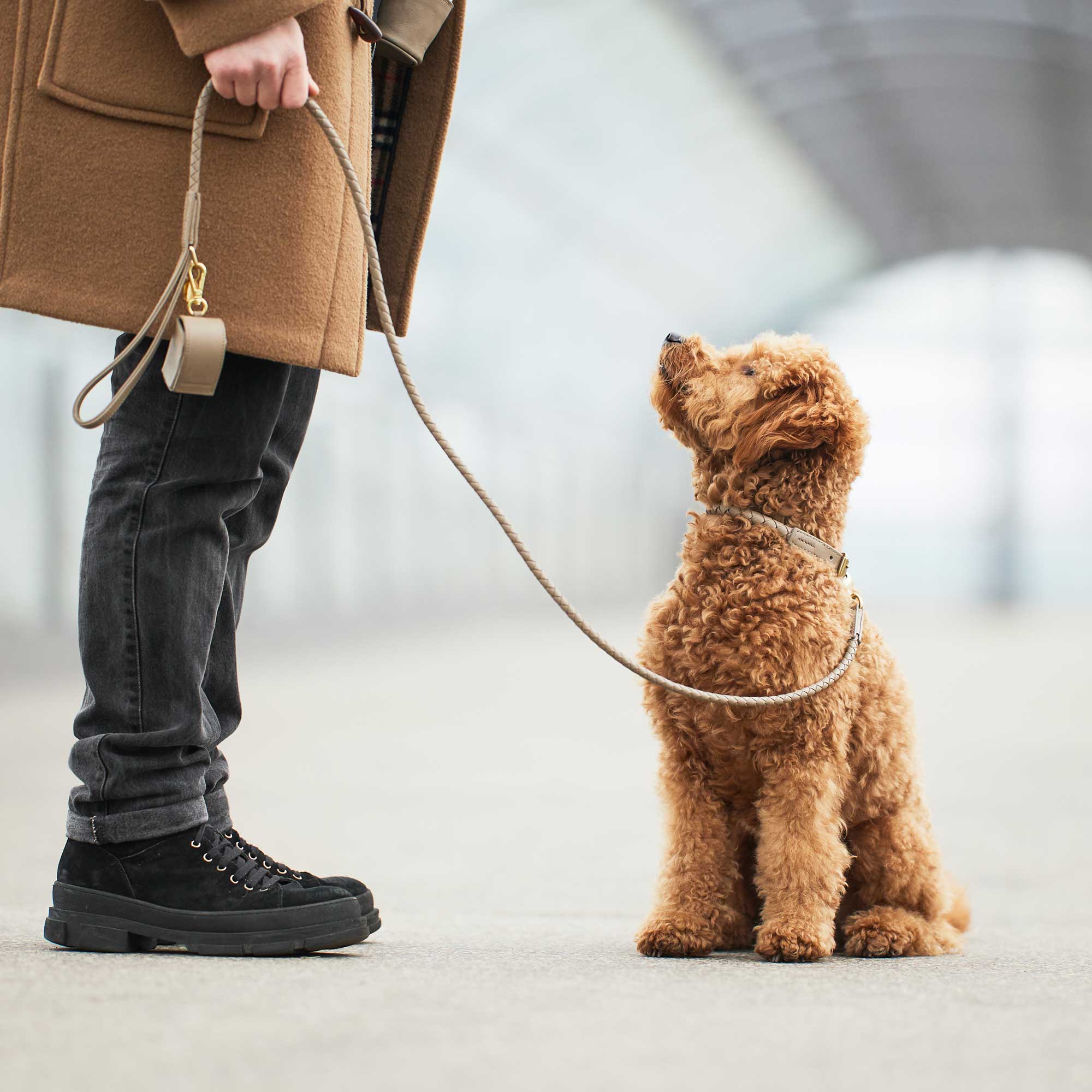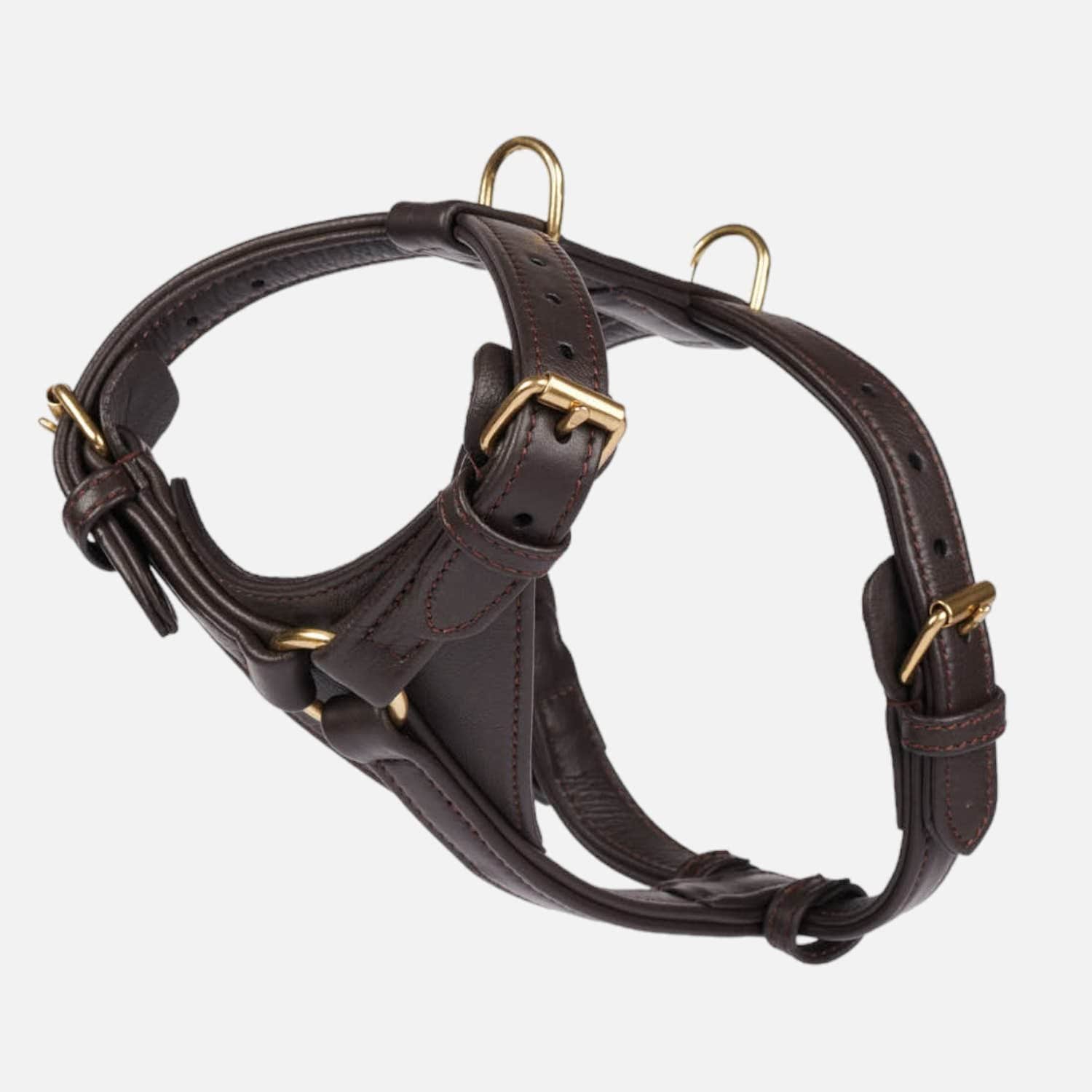 Correa de cuero marrón oscuro trenzada a mano con herrajes de latón dorado. Para perros grandes y pequeños.