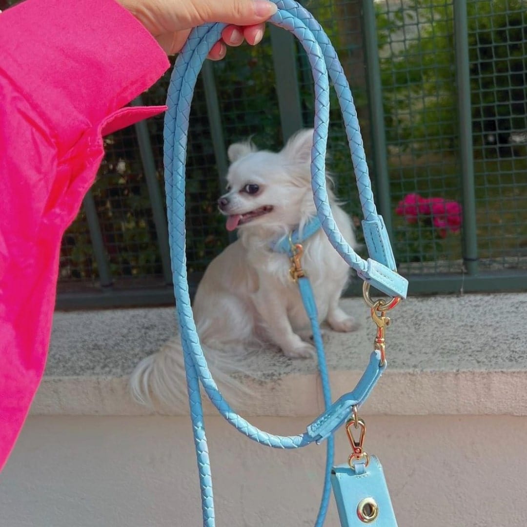 Correa (ajustable en 3 direcciones) y correa urbana (fija de 1,5 m) en tamaño estándar y tamaño pequeño con mosquetones extra pequeños para collares de las tallas XXS y XS