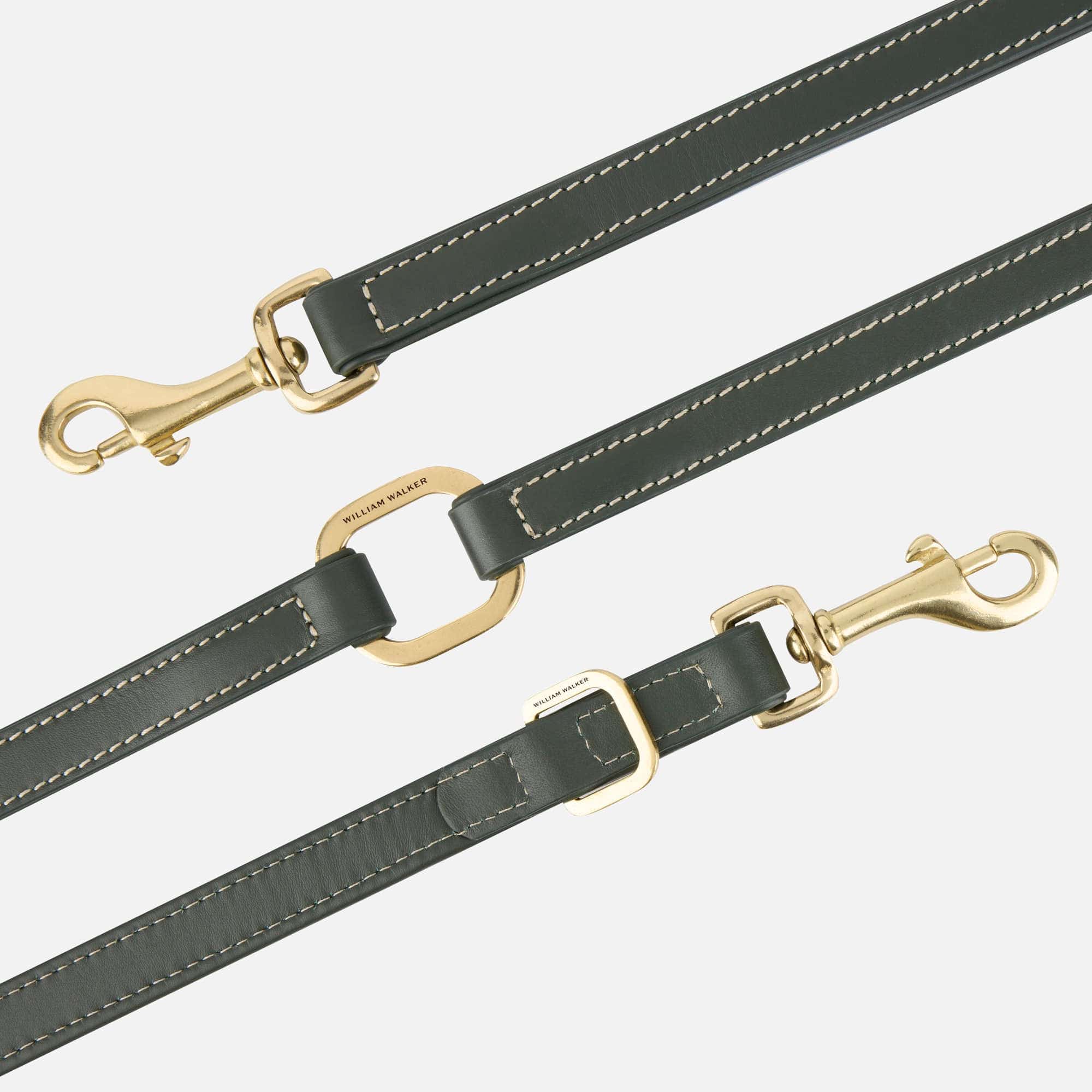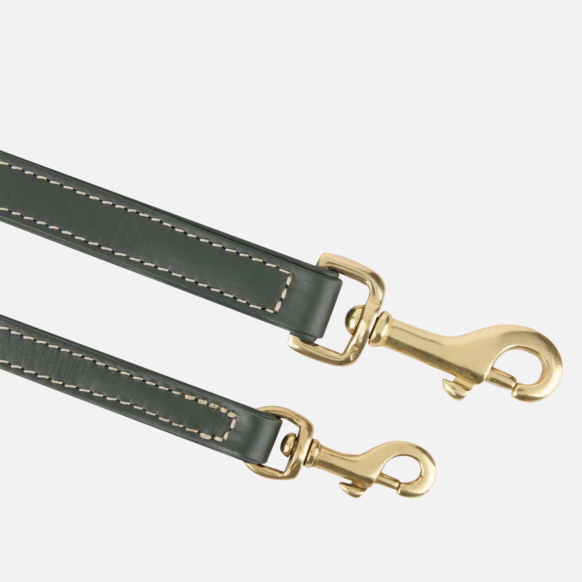 Guinzaglio per cani in pelle liscia elaborato a mano in un ricco verde scuro con finiture in ottone dorato. Disponibile in due modelli e due misure per cani di piccola e grande taglia.