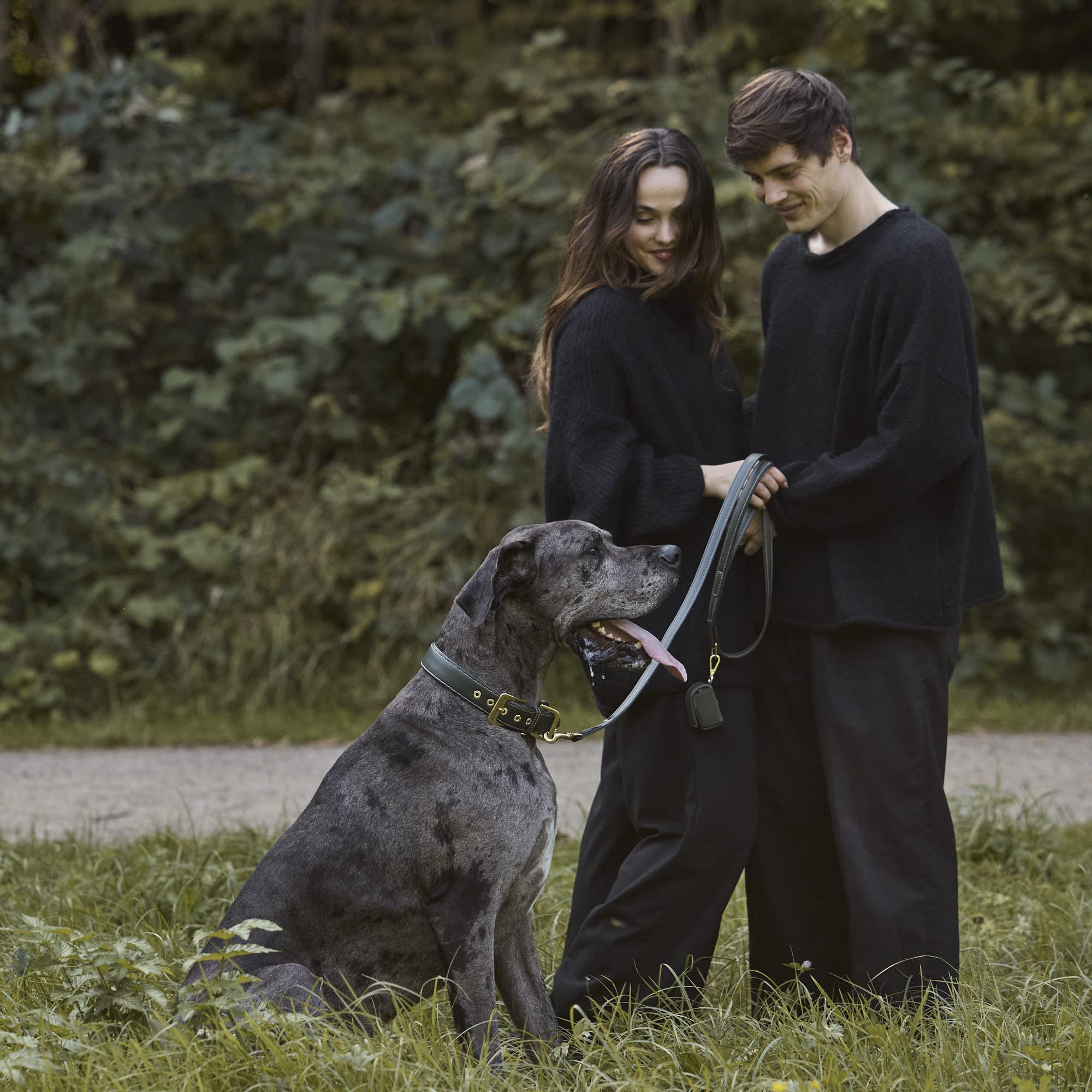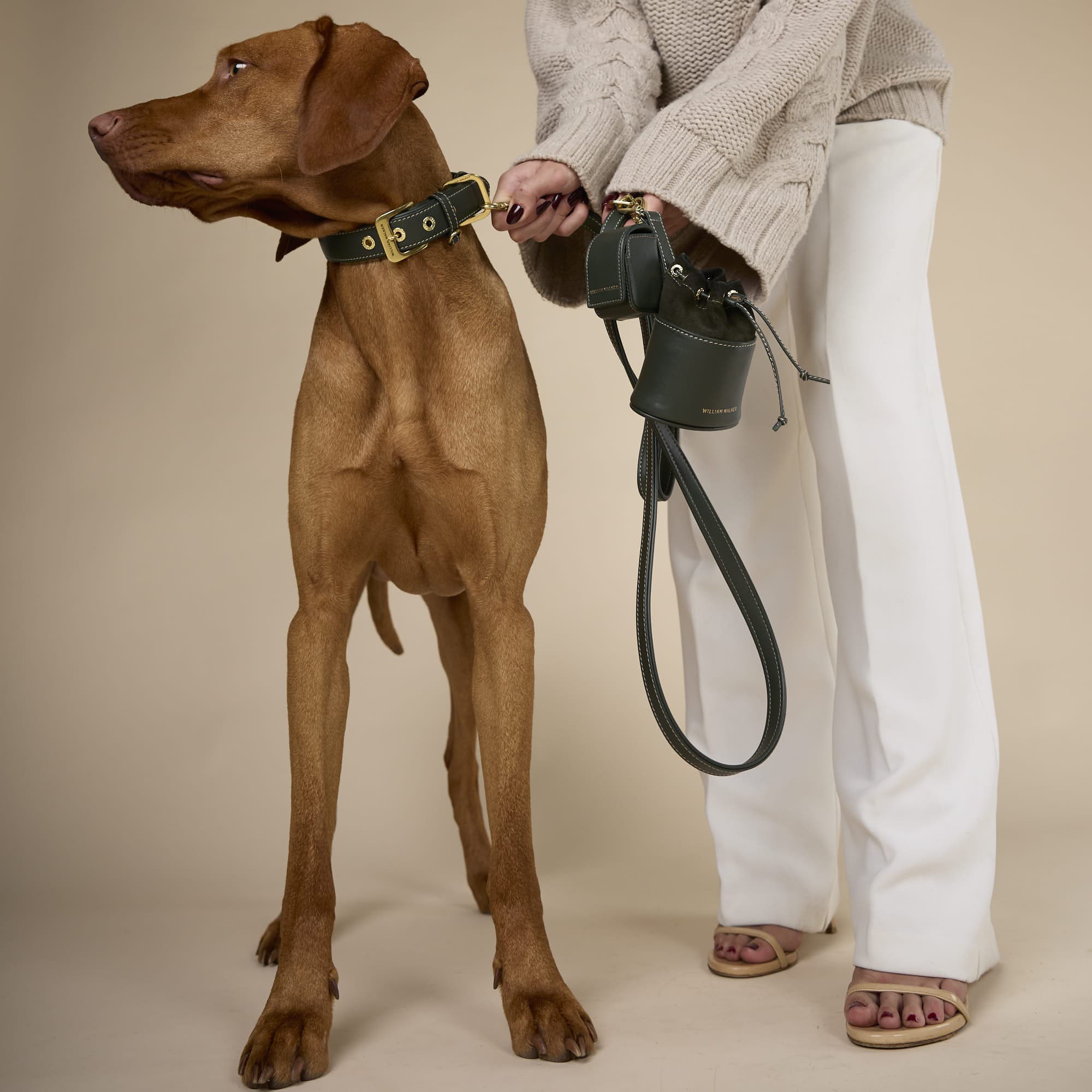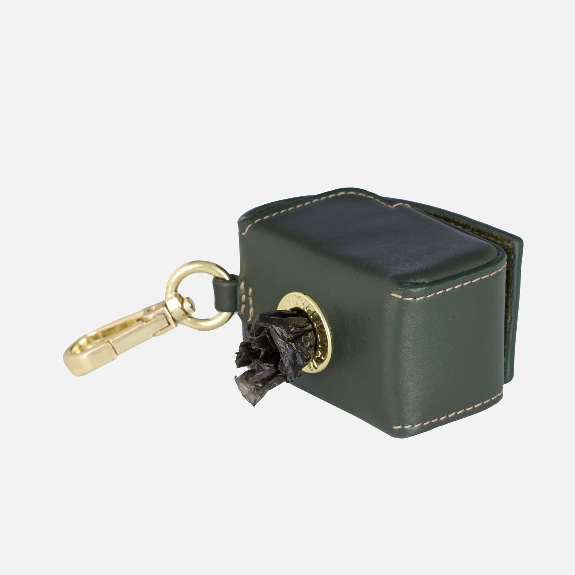 Distributore di sacchetti per la cacca realizzato a mano in pelle liscia verde scuro con una pratica apertura sul retro per estrarre i sacchetti.