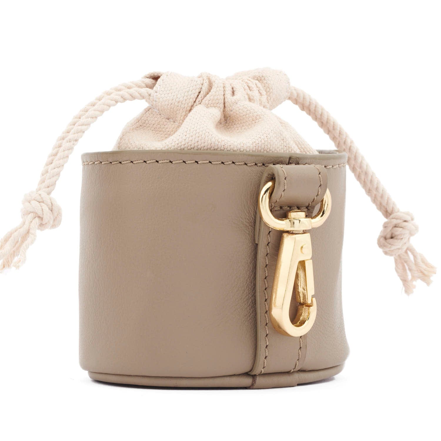 Borsa per dolcetti di alta qualità in pelle beige con pratiche opzioni di aggancio per un addestramento elegante del cane.