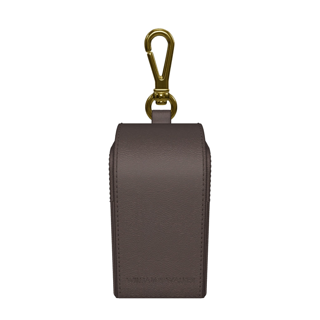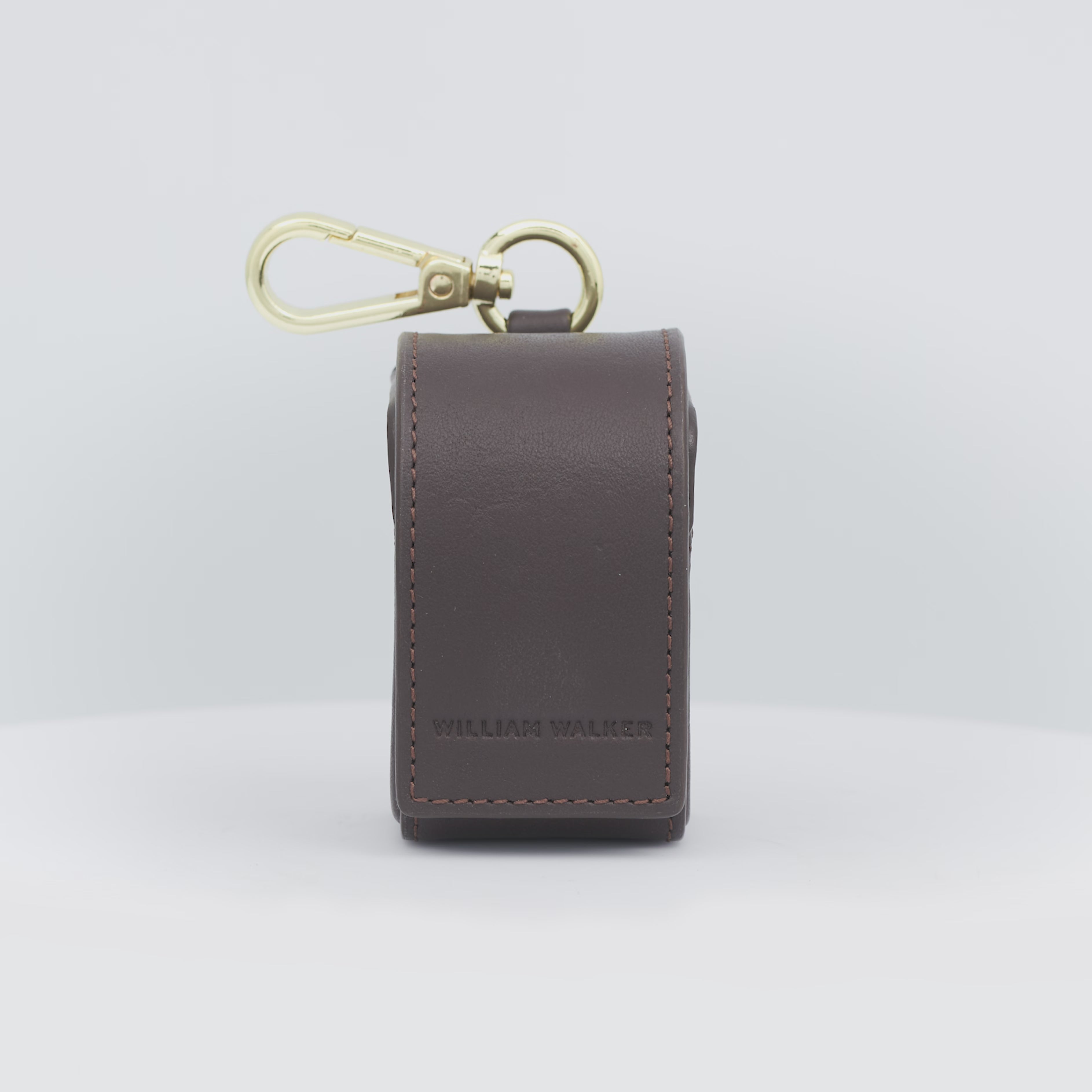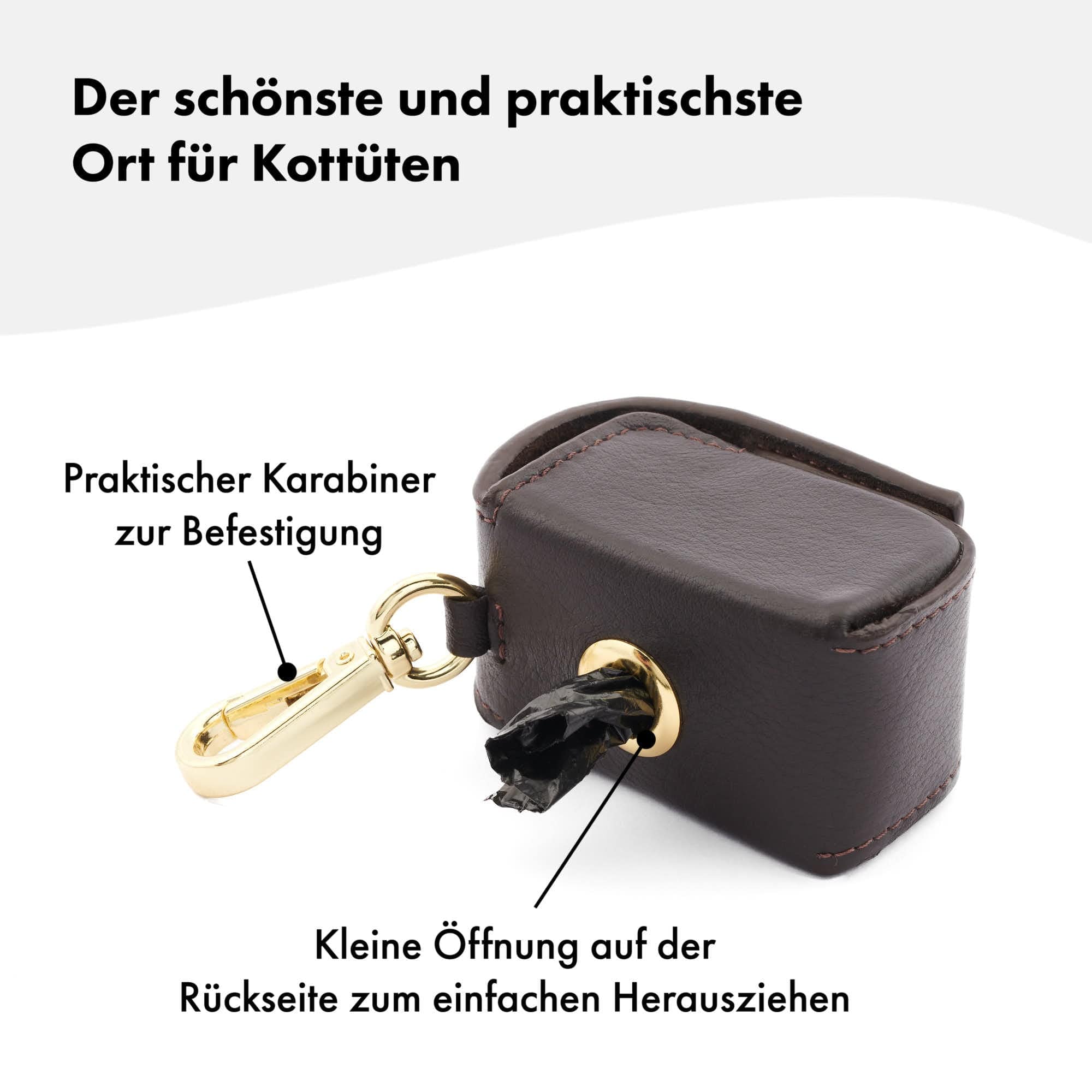 Hoogwaardige poepzakdispenser van donkerbruin leer met een uittrekbare opening aan de achterkant. Gemakkelijk te bevestigen dankzij de karabijnhaak.