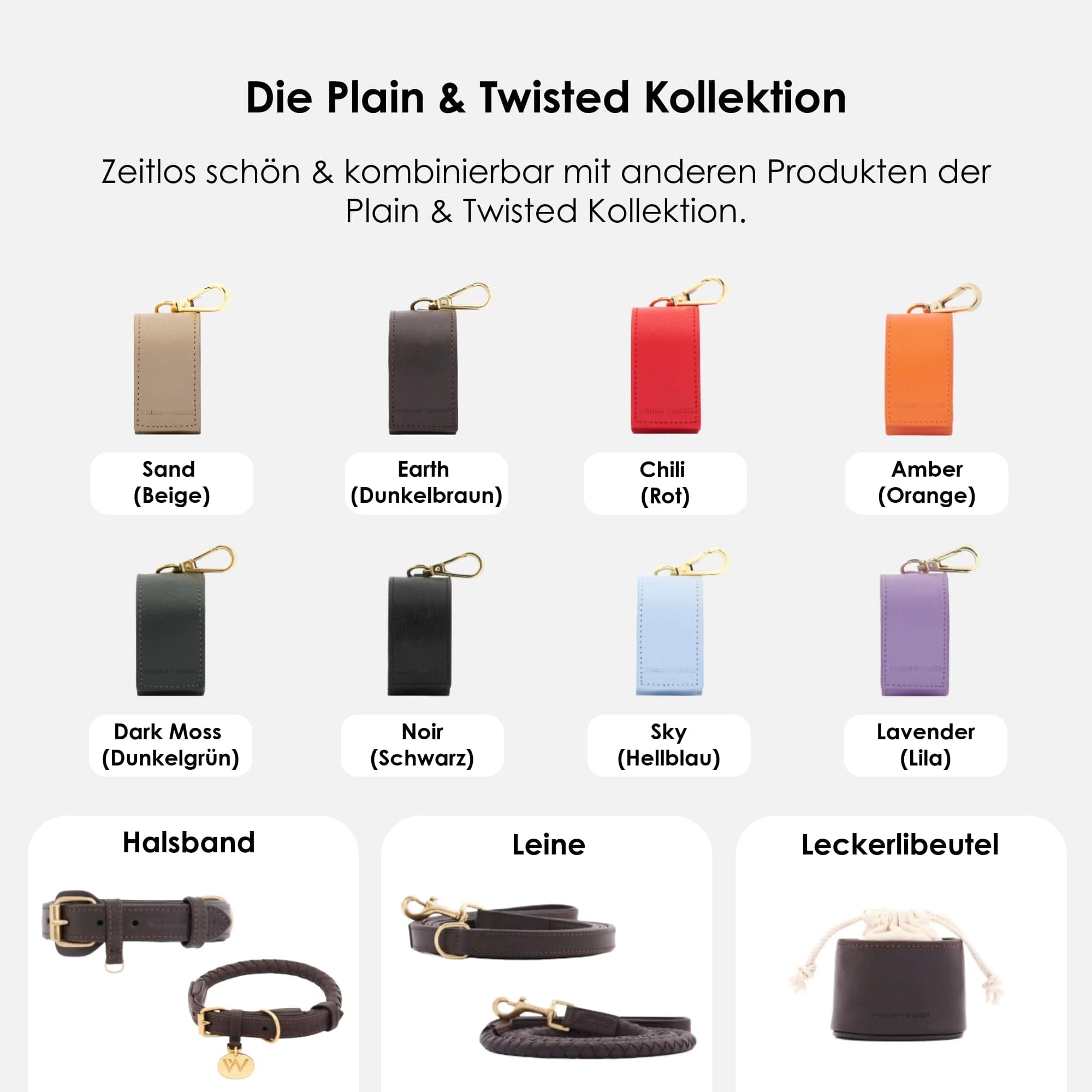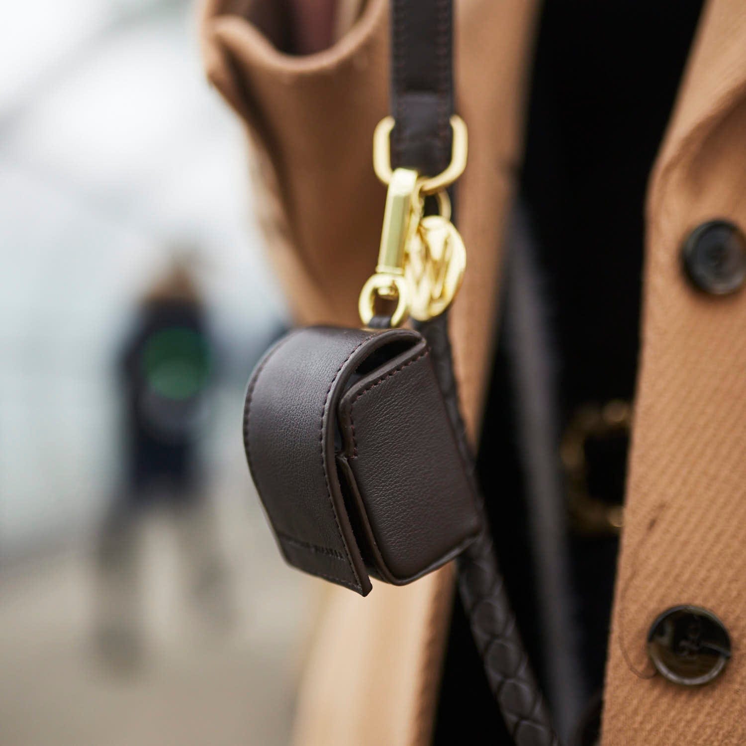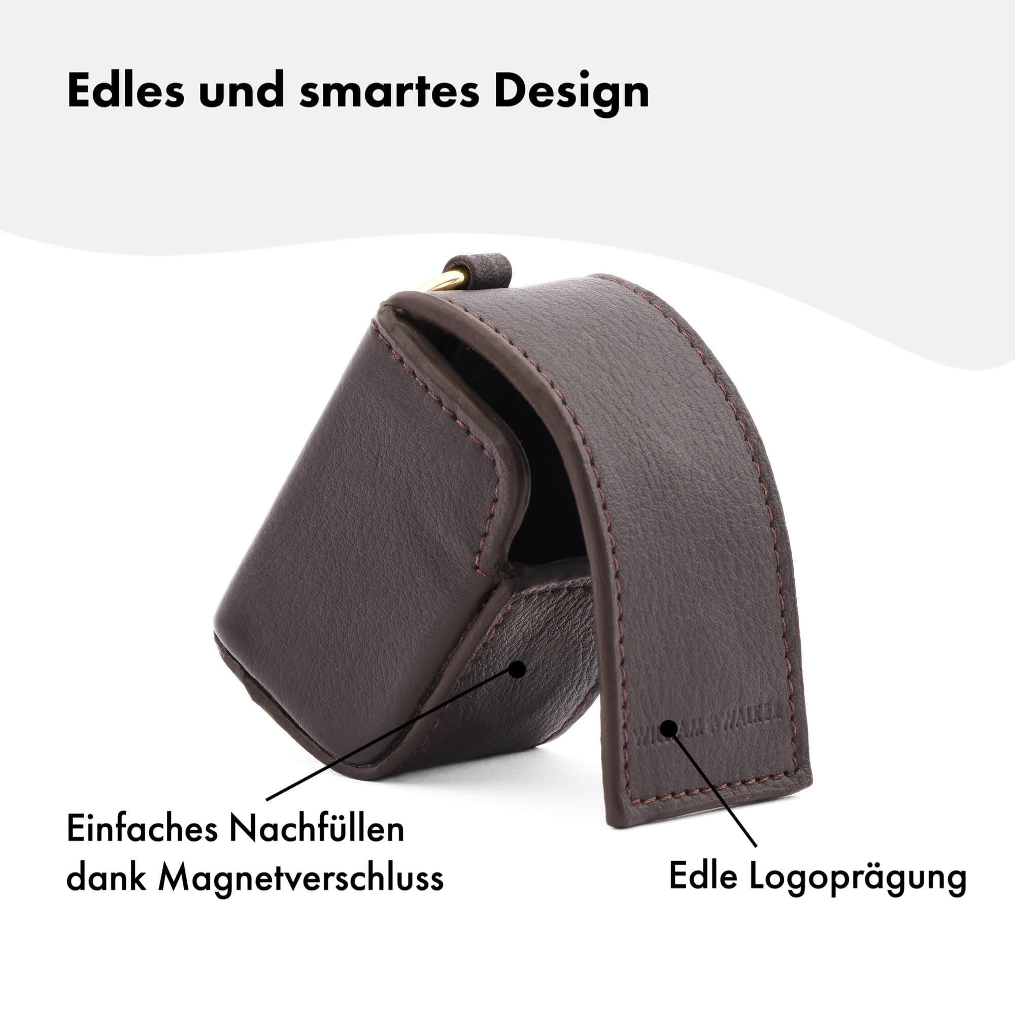 Hoogwaardige poepzakdispenser van donkerbruin leer met een uittrekbare opening aan de achterkant. Gemakkelijk te bevestigen dankzij de karabijnhaak.