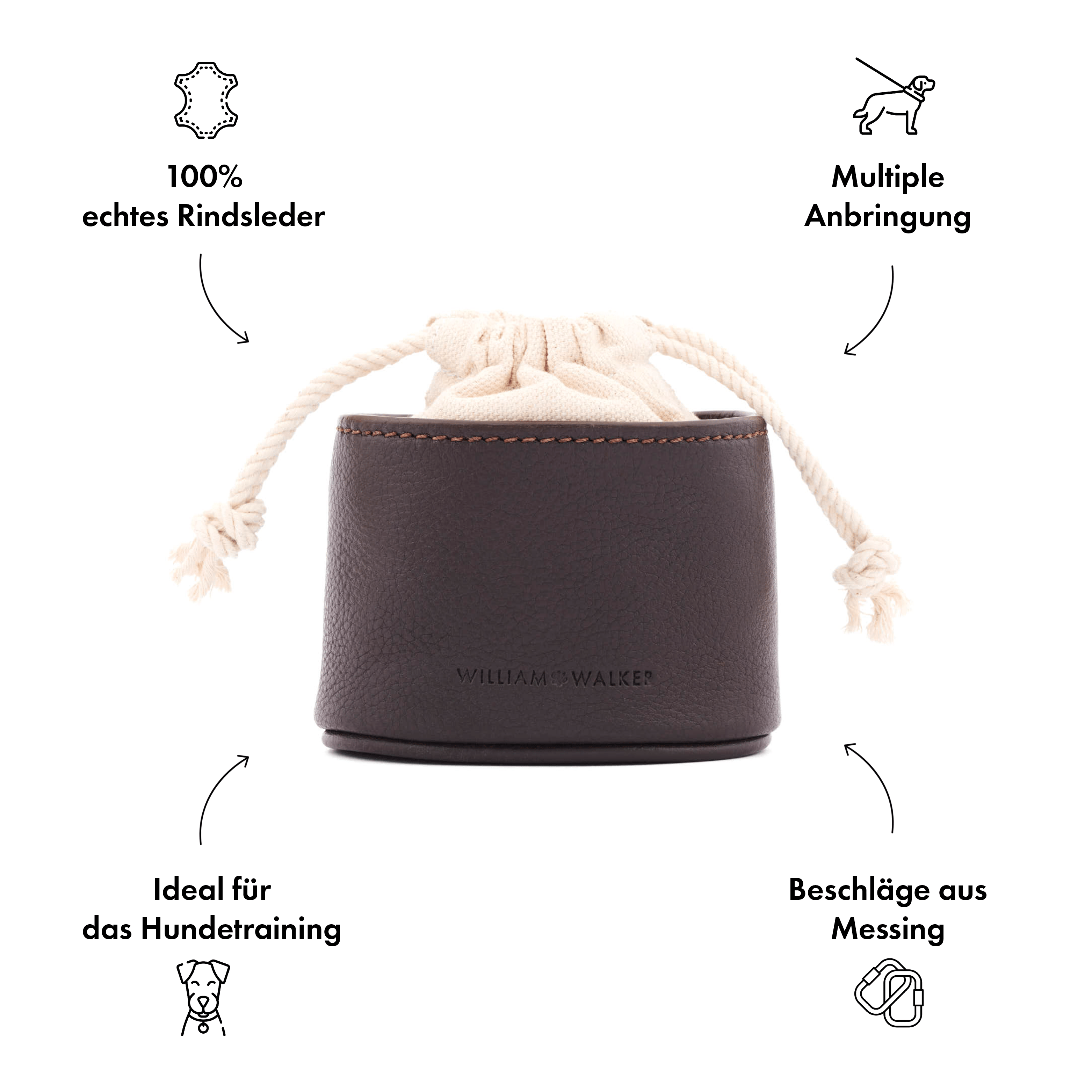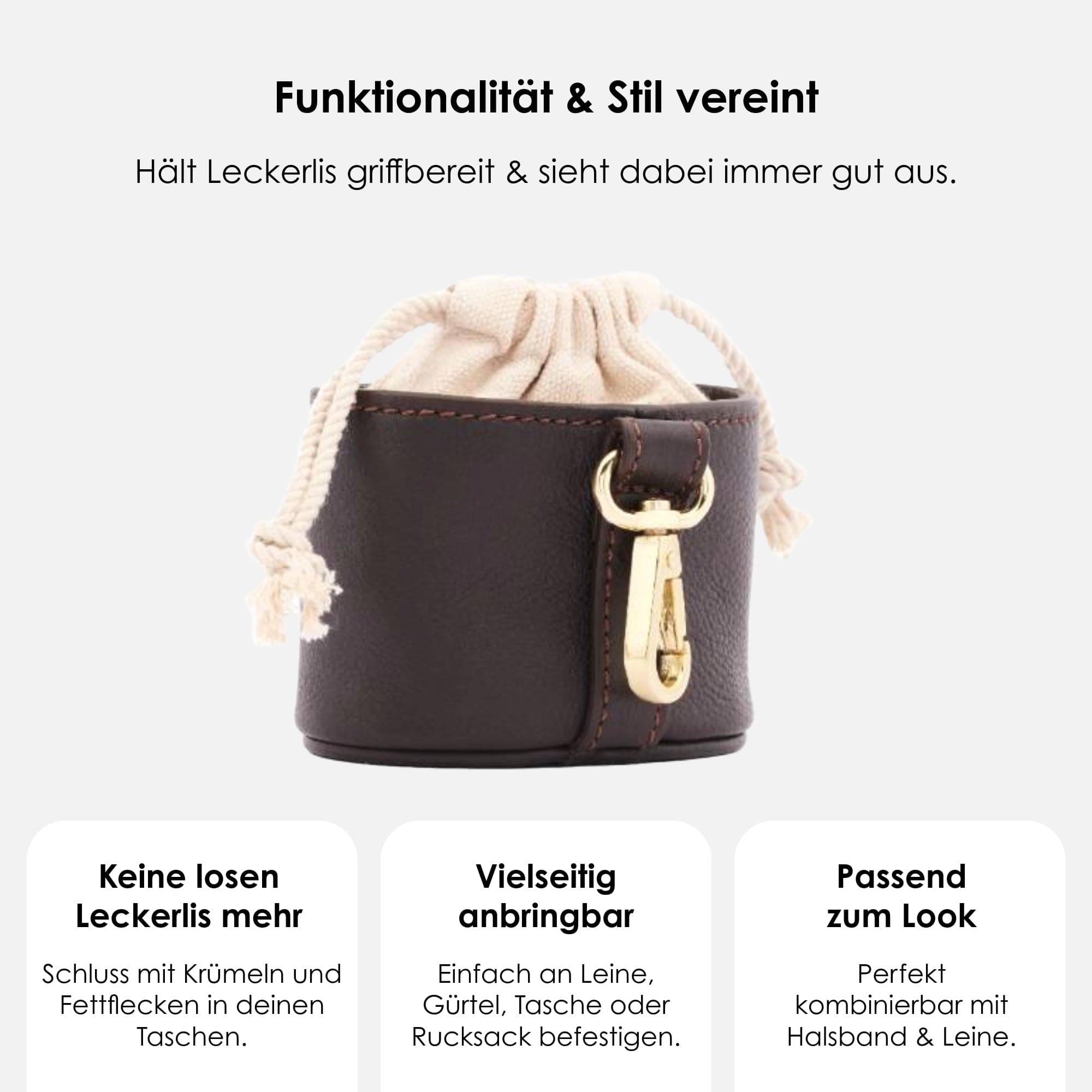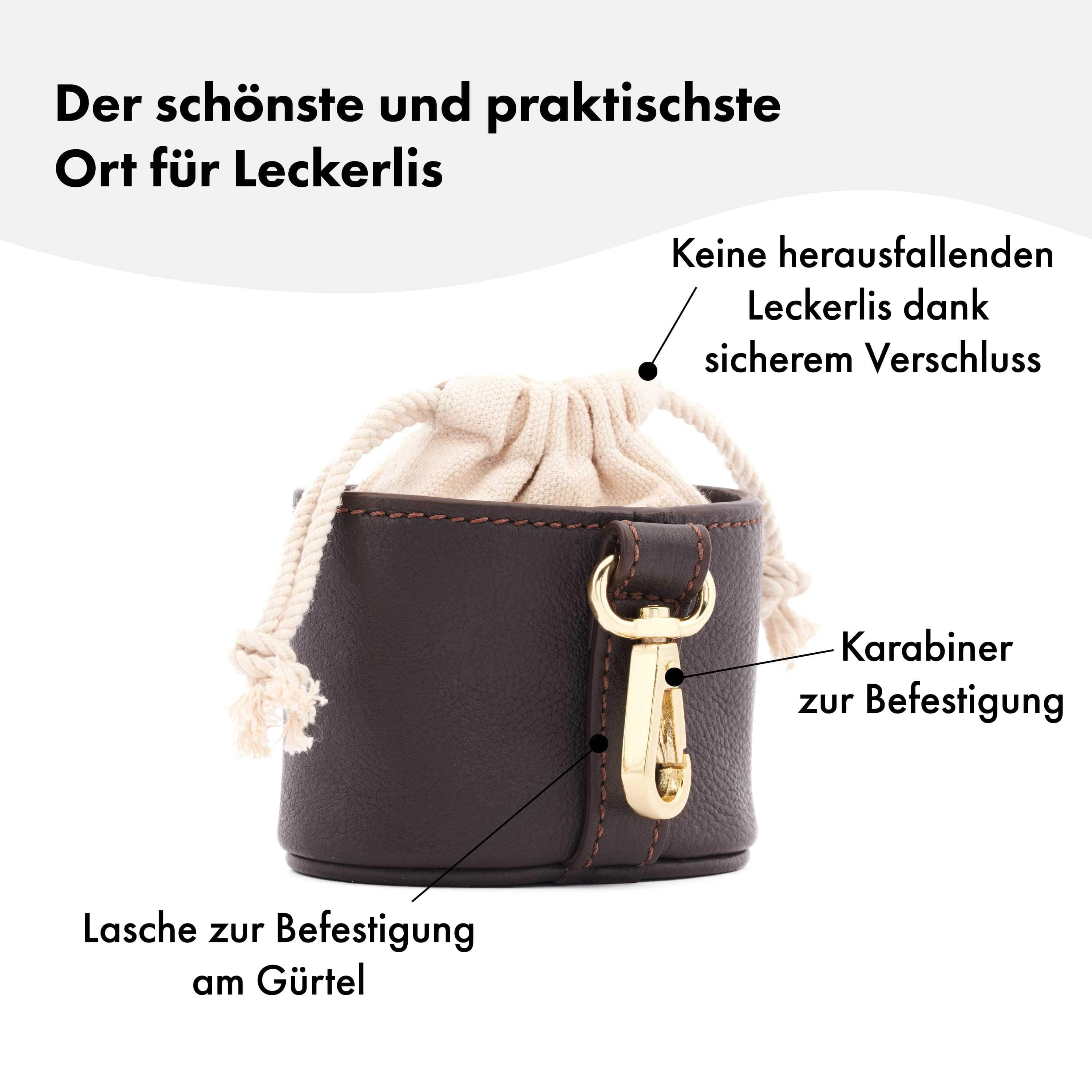 Hoogwaardige traktatietas van donkerbruin leer met praktische bevestigingsmogelijkheden voor stijlvolle hondentraining.